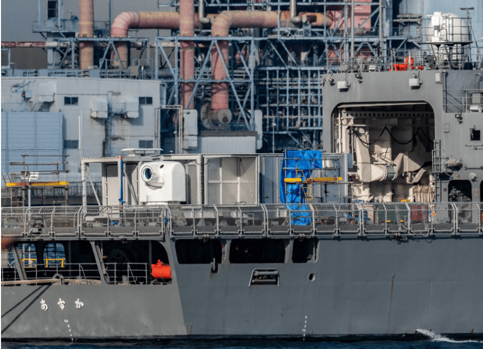 而海上自卫队则负责推进舰载版本的高能激光武器——100千瓦级“电动高功率激光系统”,研发周期从2018财年持续到2025财年。与将所有功能集成到单辆卡车上的车载系统不同,这种舰载版本的激光武器系统由两个标准集装箱组成,川崎重工负责研制的原型系统已于2023年2月完成并交付。目前在“飞鸟”号试验舰上发现这套高能激光系统将用于评估未来利用高能激光武器对抗导弹的可行性。关键评估项目包括对小型无人机和迫击炮弹的破坏效果、持续作战能力、目标捕获和 跟踪性能、与目标搜索传感器的集成以及在各种环境条件下的作战性能。